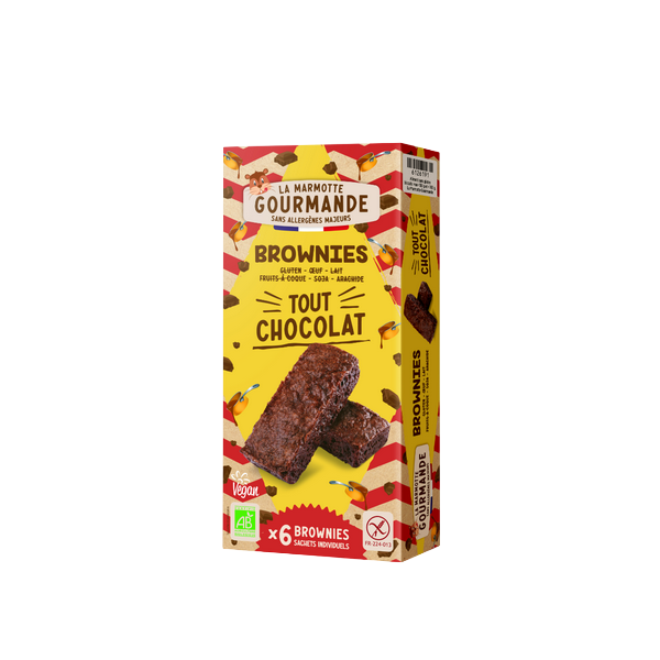 conditionnés dans un étui en carton (6 brownies individuels de 25g chacun par étui), qui tient debout à la verticale dans le rayon à côté de nos cookies, afin de maximiser l'espace linéaire !
